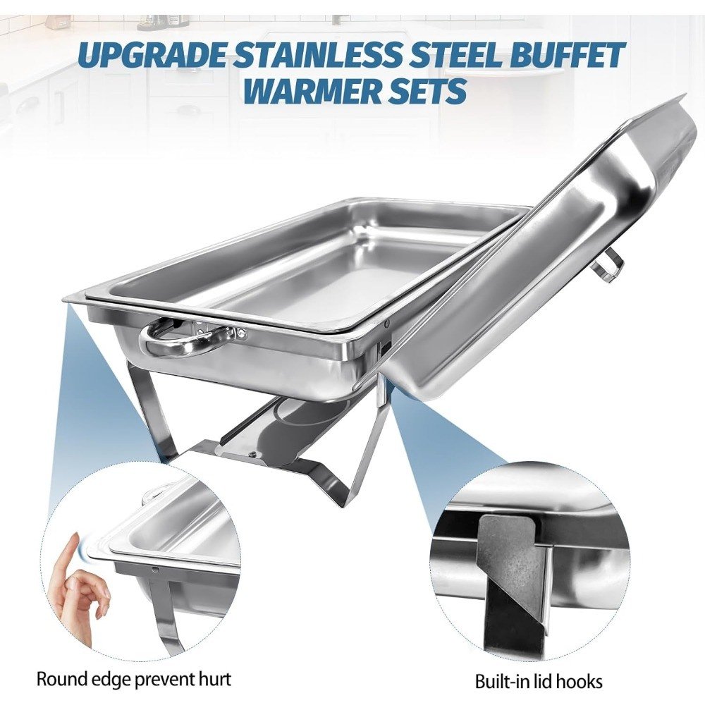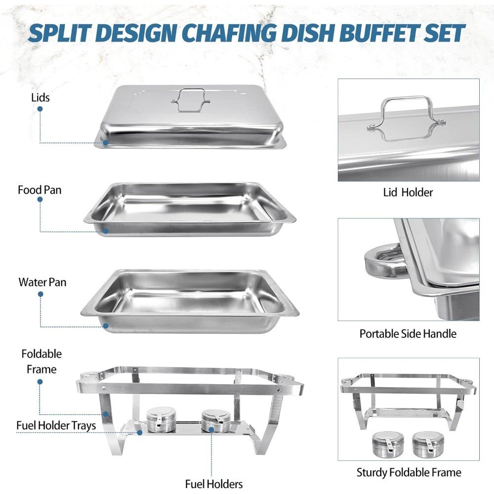 • Package Includes: the chafing dish buffet set includes 2 sets of 8 quart chafing dishes, 2 pieces folding frames, 2 pieces lids, 2 pieceswater trays, 2 pieces food trays, 4 safety fuel holders (fuel not included), ideal for buffets, wedding banquets and catering event supplies.