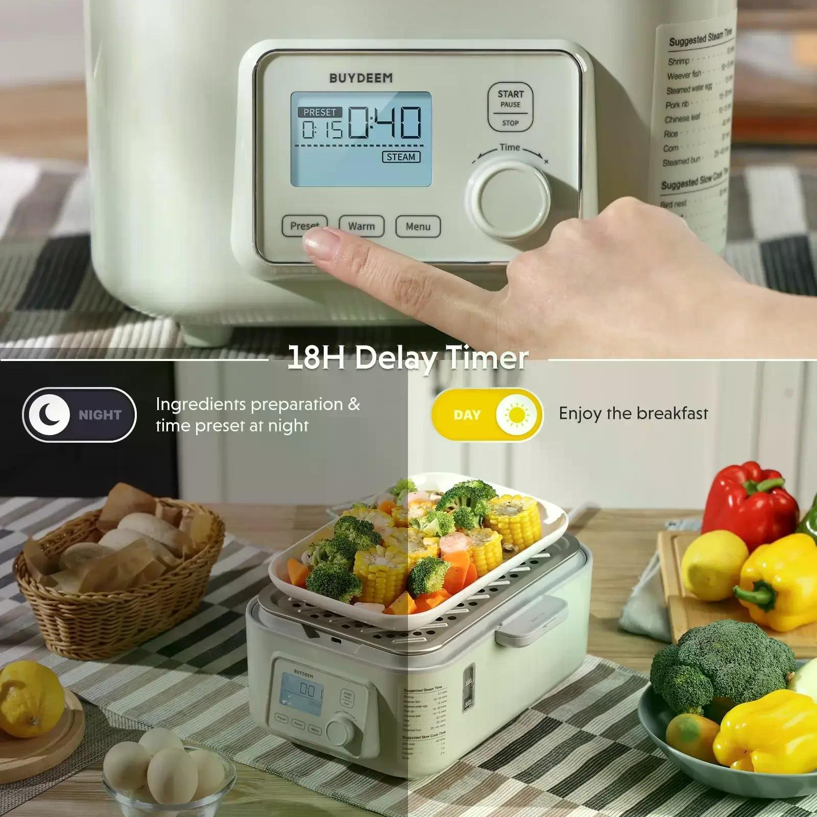 • Timing Function & Easy Operation - This digital steamer produces steam quickly within 1 min., without leaking air or spraying water. It can keep the nutrition and freshness of food while ensuring the cooking speed. The booking starting function is very convenient, pre-programed and you can eat at your desired time.