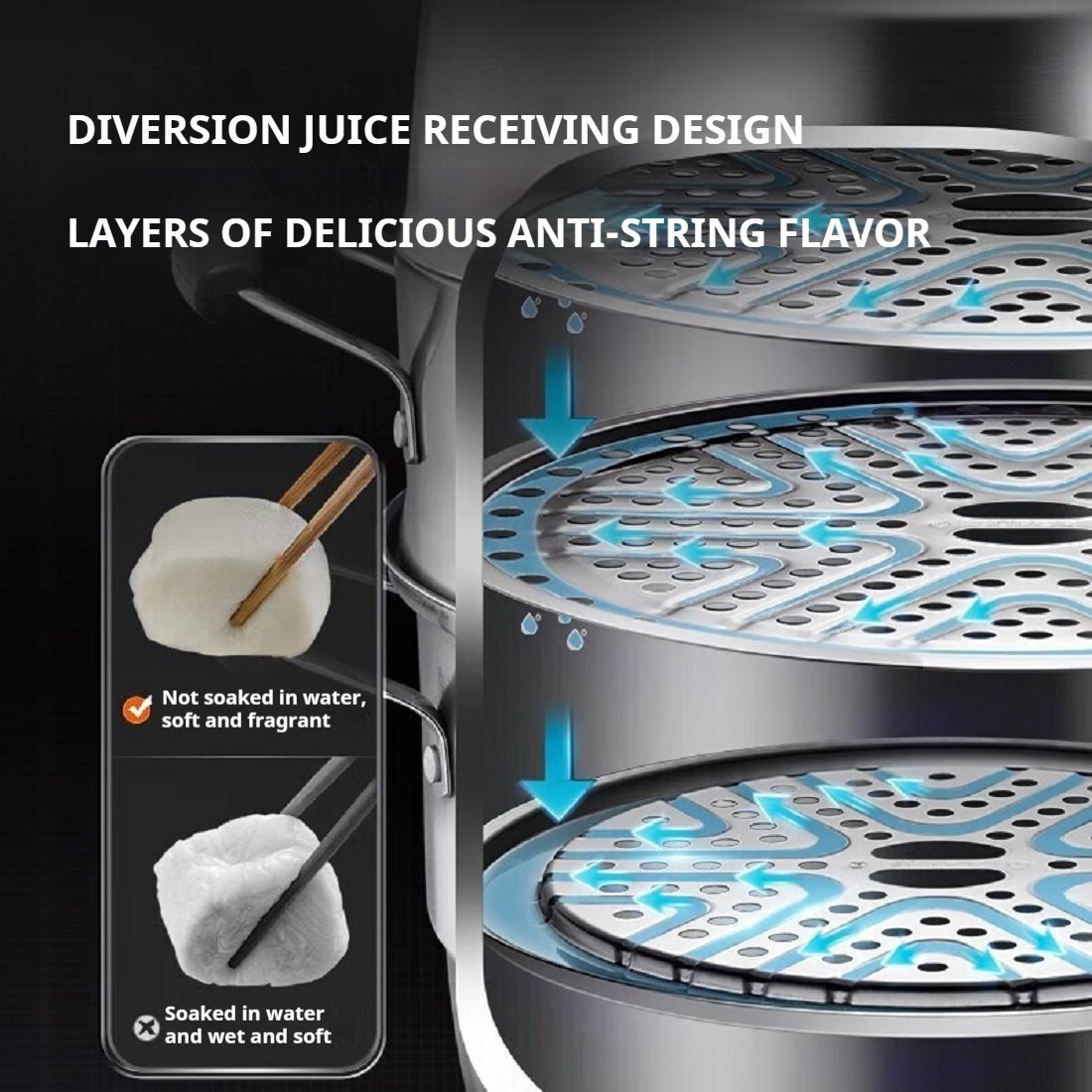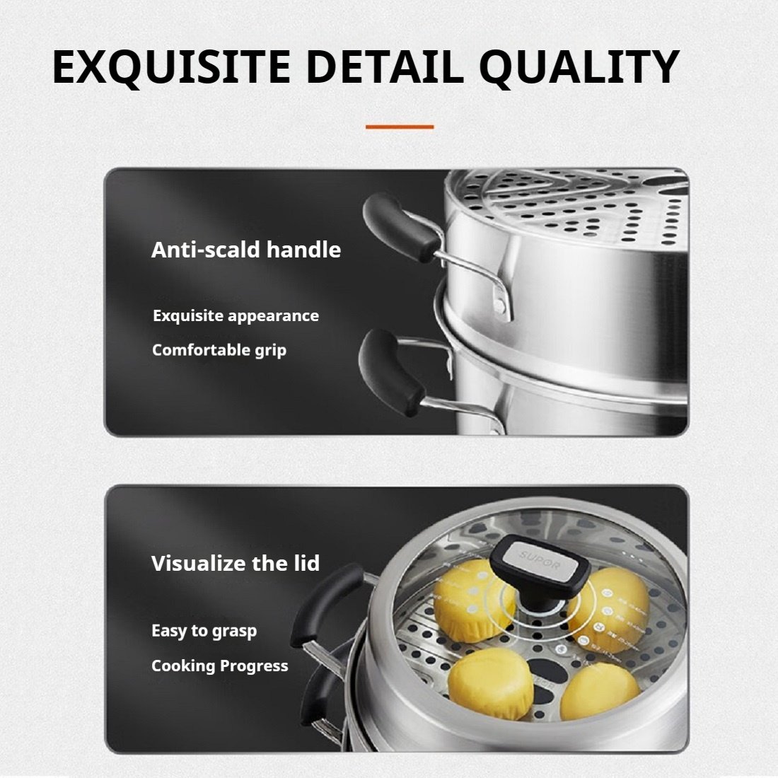 1.1.Shallow steaming compartment, easy to put and take, to prevent scalding, infusion design, food is fresh and not easy to string flavour, three layers of large capacity, at will combination, stacking storage, save kitchen space.
