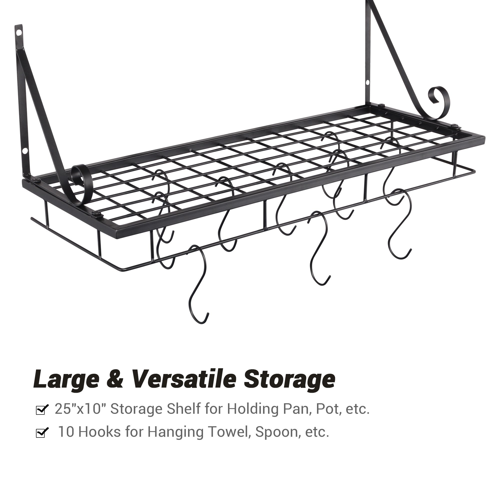 - Versatile Storage - Aquaterior Wall Mount Cookware Rack features 25"x10" large storage shelf for holding pan & pot; keeping large amount of cookware organized and tidy; also great for putting plants at balcony; books in reading room; toiletries in bathroom; 10 removable hooks provide extra storage for hanging towel; spoon and so on